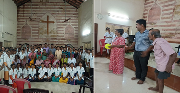 The in charge of the old age home, Mr.Babu invited us and had given brief introduction and history regarding old age home, There were 35 old age inmates in that old age home. Our students conducted various recreational activities, health education programme and some recreational games were also arranged for old age inmates. Our students and staff were spent few time with old age people.